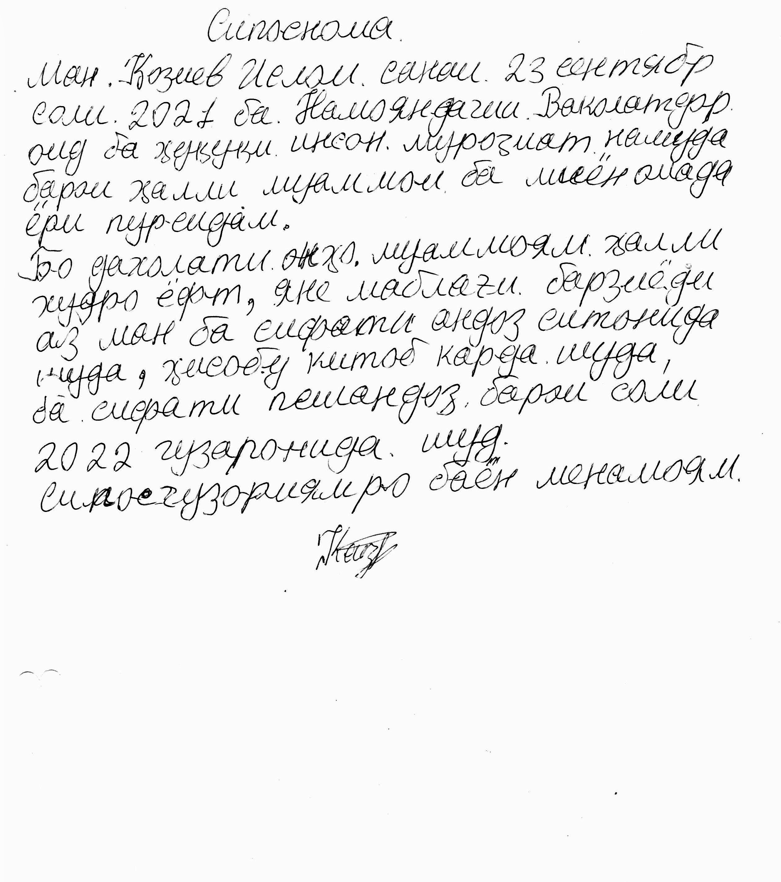 Санаи 21 сентябри соли 2021 ба суроғаи Намояндагии Ваколатдор оид ба ҳуқуқи инсон дар вилояти Суғд аризаи шикояти аз номи шаҳрванд Қозиев И. ворид шуд. Дар аризаи мазкур чунин омада буд: